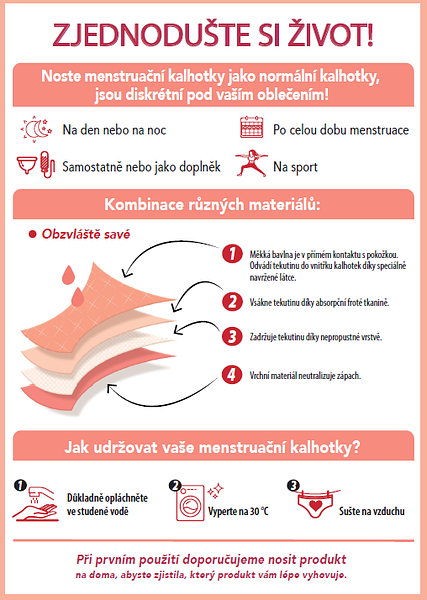 Bavlněné noční i denní menstruační kalhotky s nohavičkou, které Vám zajistí dokonalou svobodu a pohodlí. Tyto kalhotky jsou příjemnou alternativou, která je zdravá i ekologická. Jejich technologie Vás ochrání proti úniku i zápachu. Poskytují až 12 hodin ochrany po celý cyklus, jsou extrémně savé. Kalhotky lze prát v pračce na 30 °C. Díky plochým švům jsou neviditelné pod oblečením.